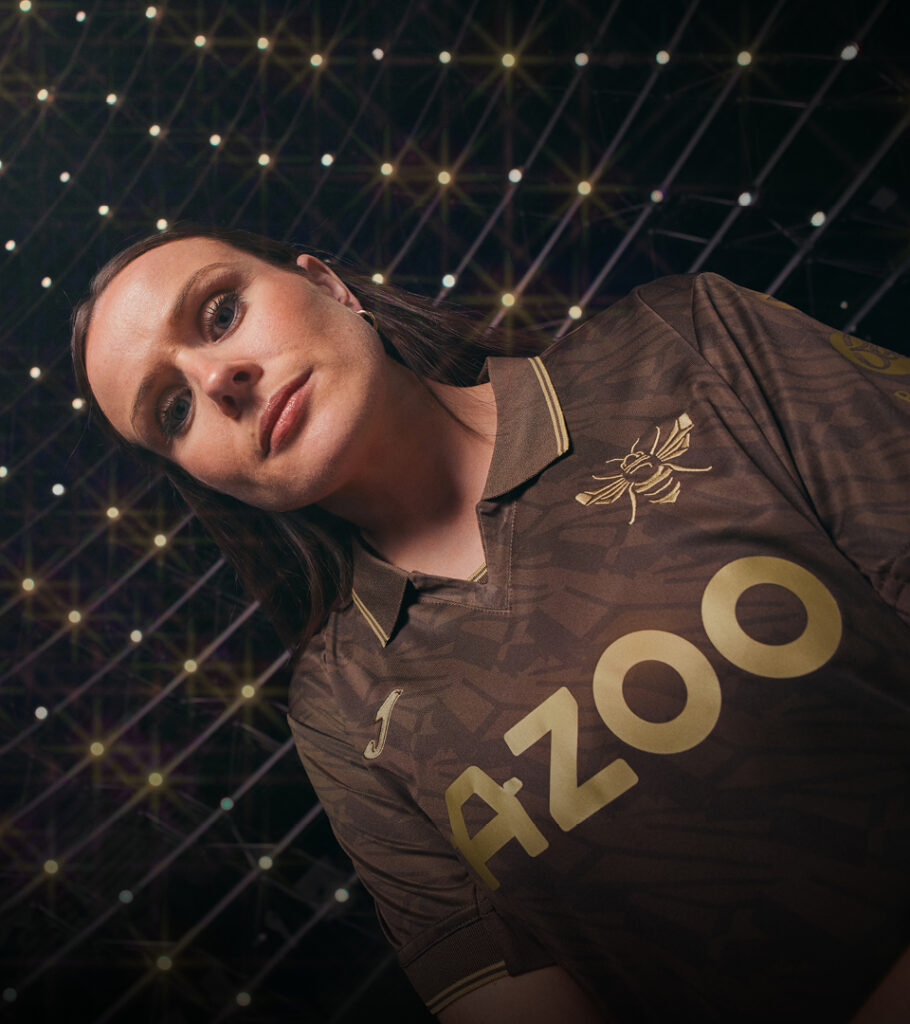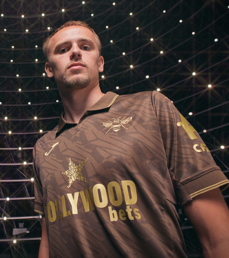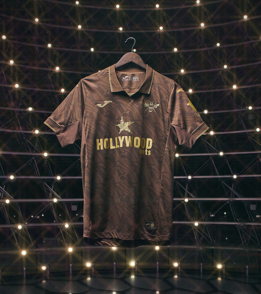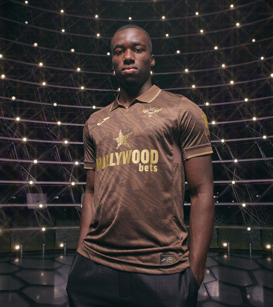 For Brentford’s 25/26 away kit, Joma put the Bee front and centre. For the first time, the club’s iconic Bee silhouette stands alone in gold, over a rich, brown wing-patterned base.