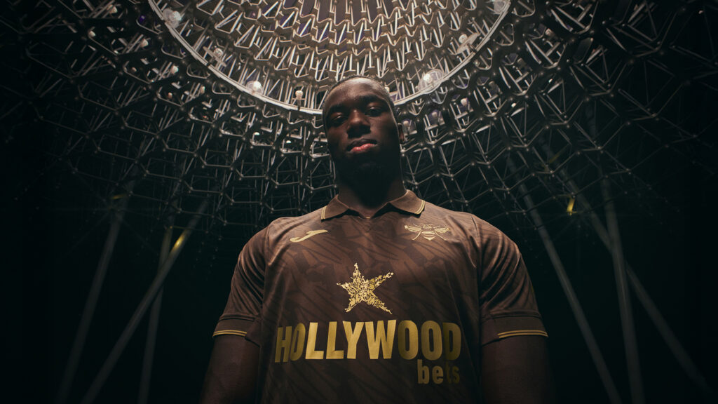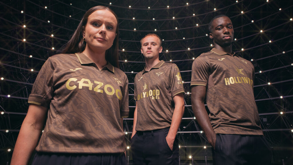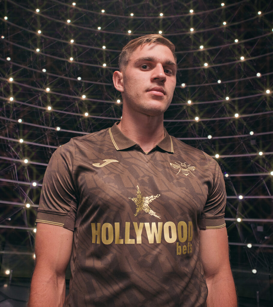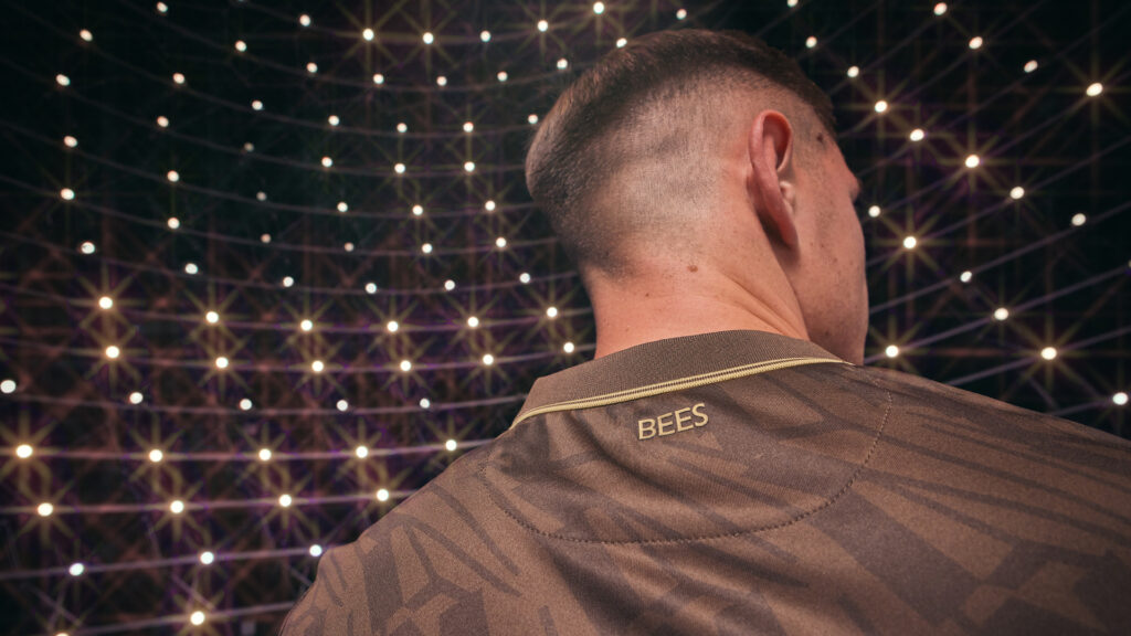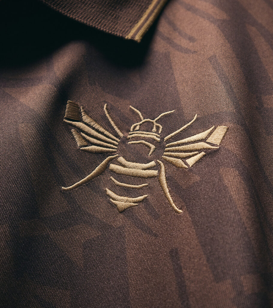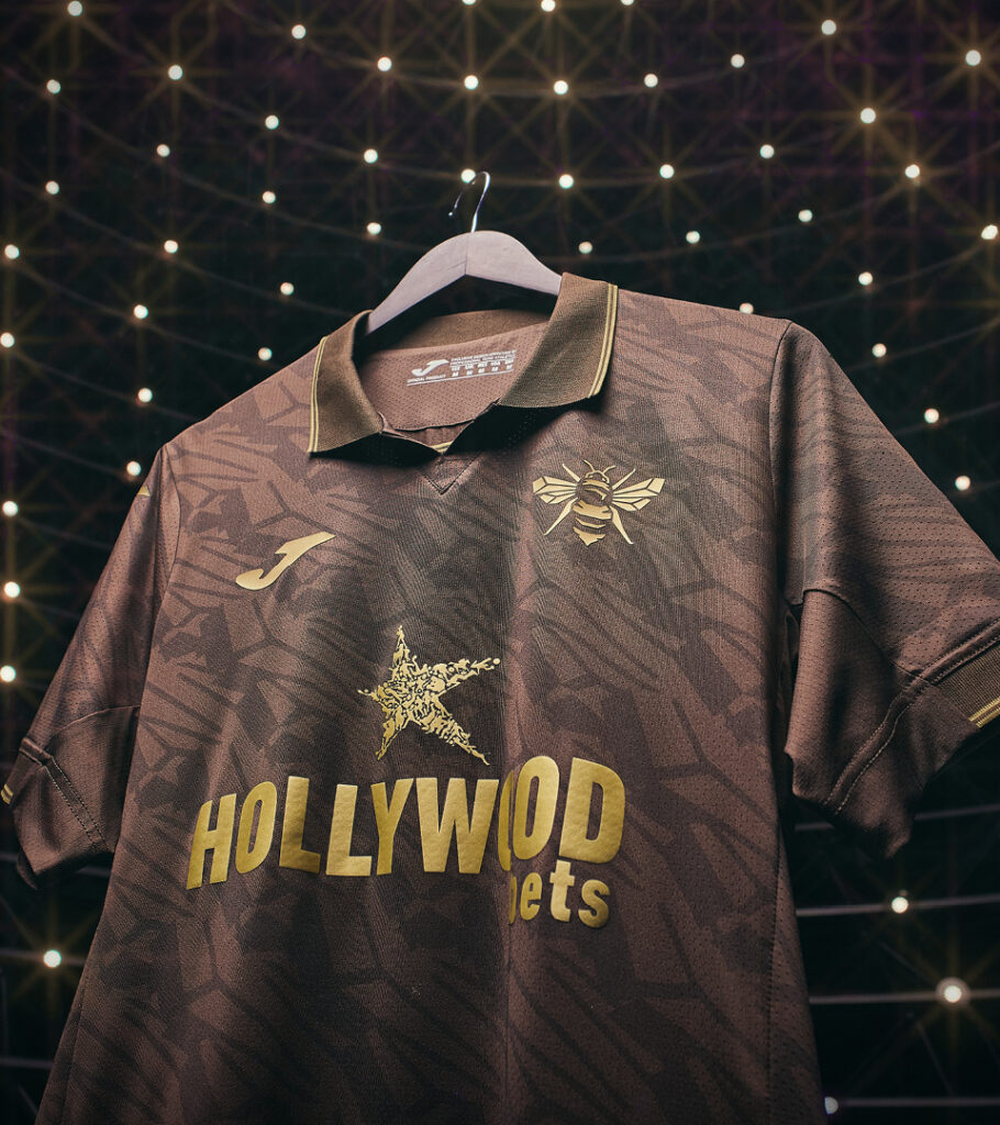 For Brentford’s 25/26 away kit, Joma put the Bee front and centre. For the first time, the club’s iconic Bee silhouette stands alone in gold, over a rich, brown wing-patterned base.